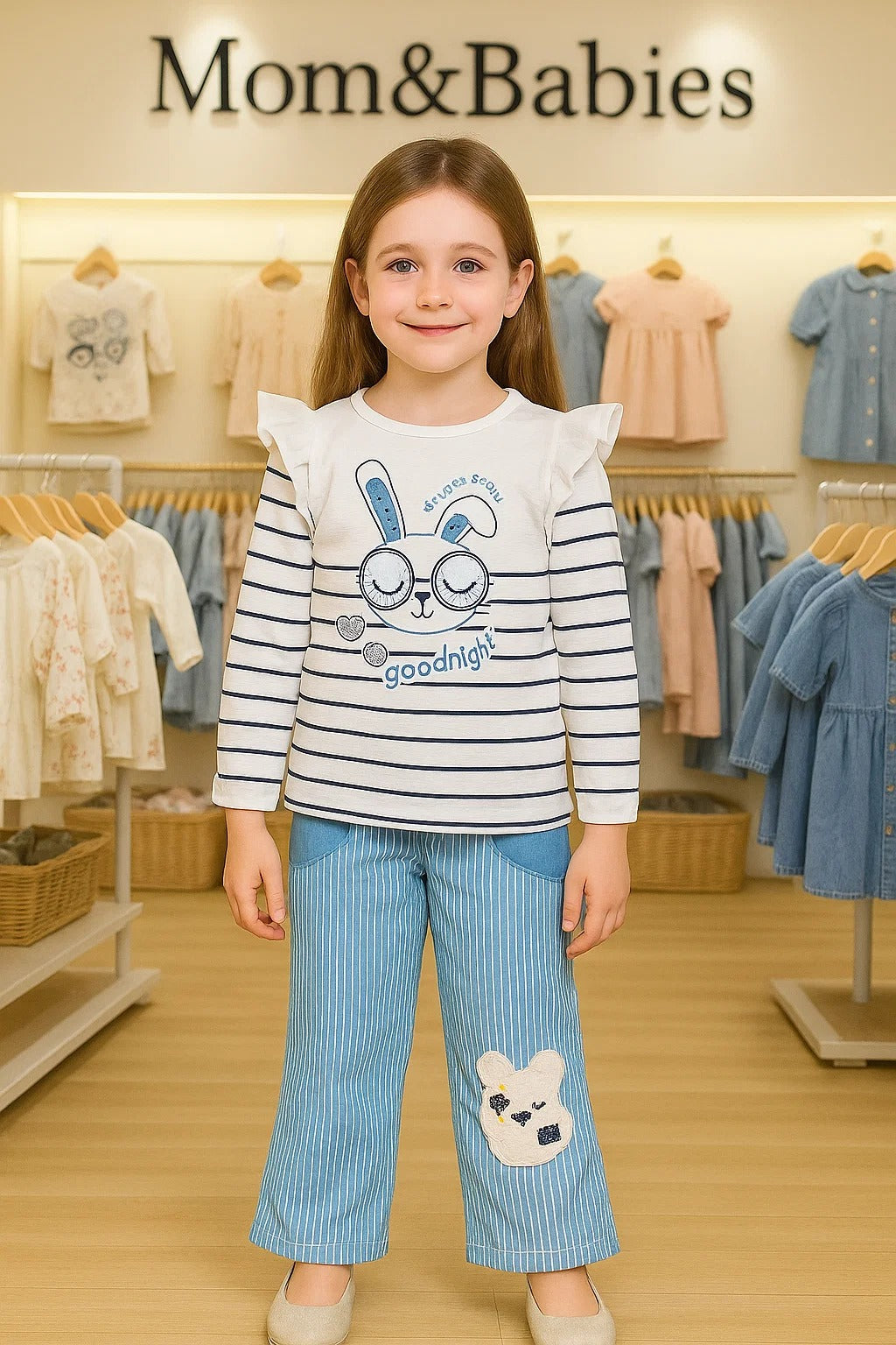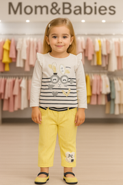 Give your little princess the perfect blend of comfort and cuteness with this 2-piece Baby Girl Outfit Set. The soft cotton full-sleeve top with an adorable bunny print pairs beautifully with the striped trousers featuring a cute patch. Lightweight, breathable, and comfortable for all-day wear