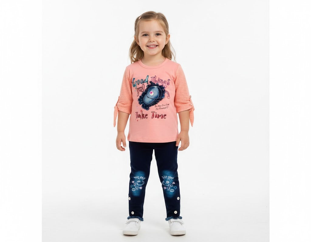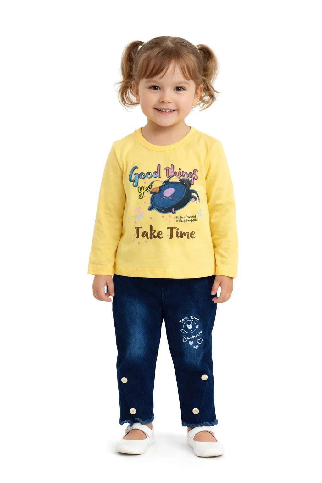 The 2-piece set includes a yellow full-sleeve printed T-shirt with an adorable graphic design and a matching denim trouser featuring cute printed details. The bright color and soft fabric make this outfit perfect for daily wear, playtime, and casual outings.